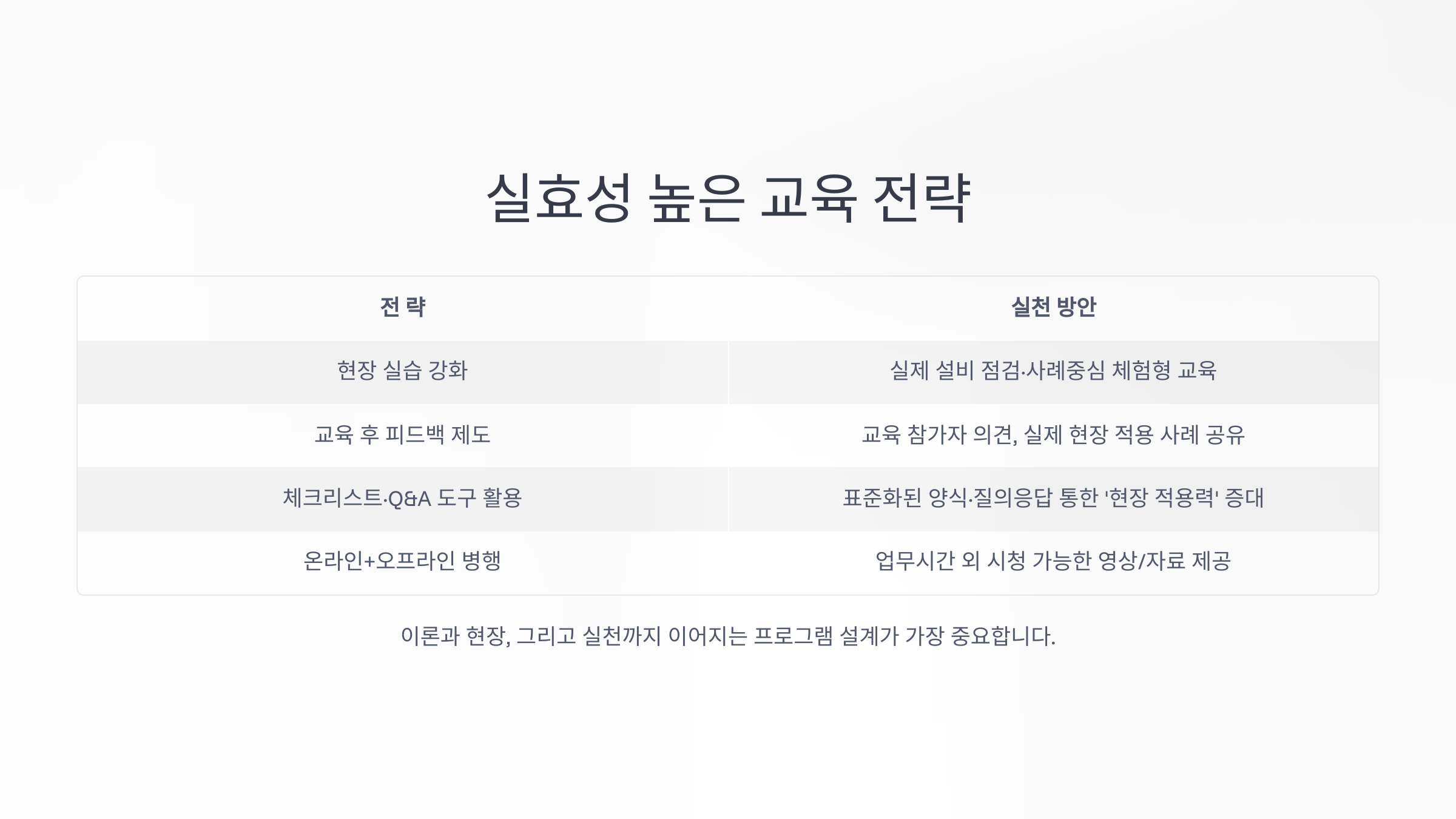 실무에 바로 적용하려면, 현장 맞춤형 교육과 더불어 교육-현장-피드백의 선순환 구조가 꼭 필요합니다.