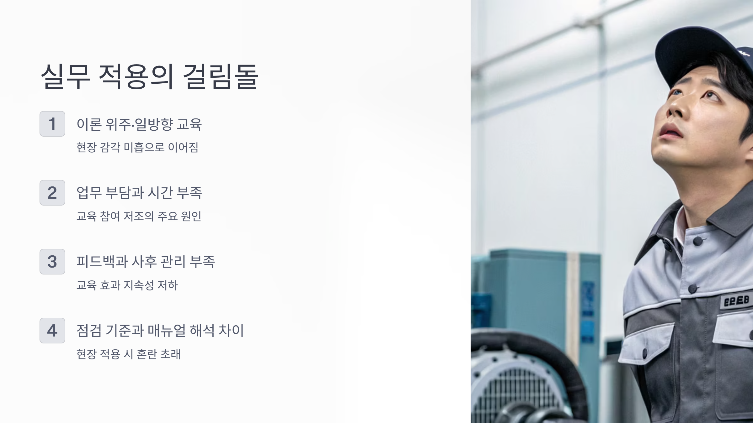 교육을 제대로 받아도 실무에 적용하지 않으면, 부실 점검과 저가 수주의 악순환이 반복될 수밖에 없습니다.
