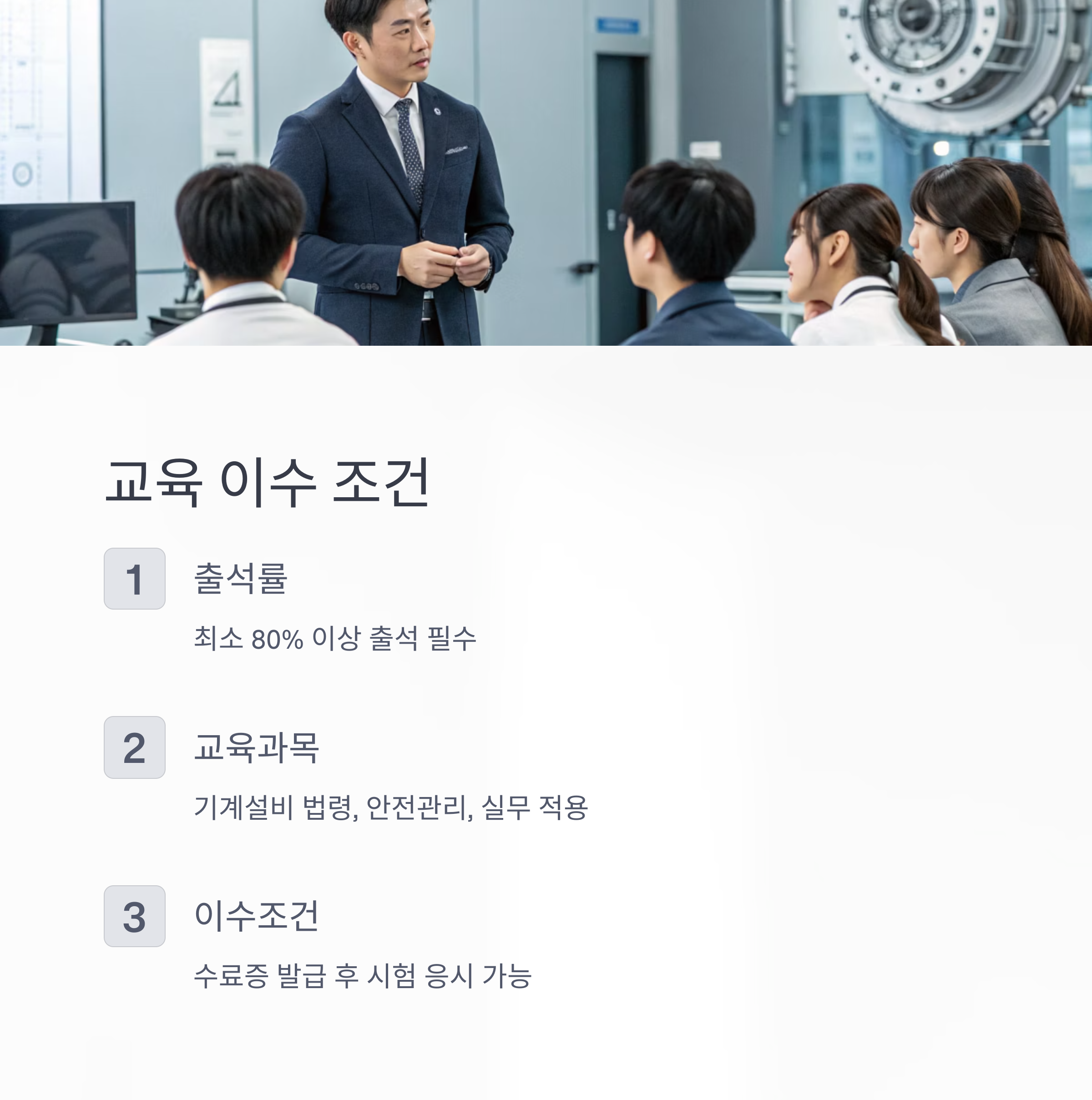| 교육과목 | 기계설비 법령, 안전관리, 실무 적용 |