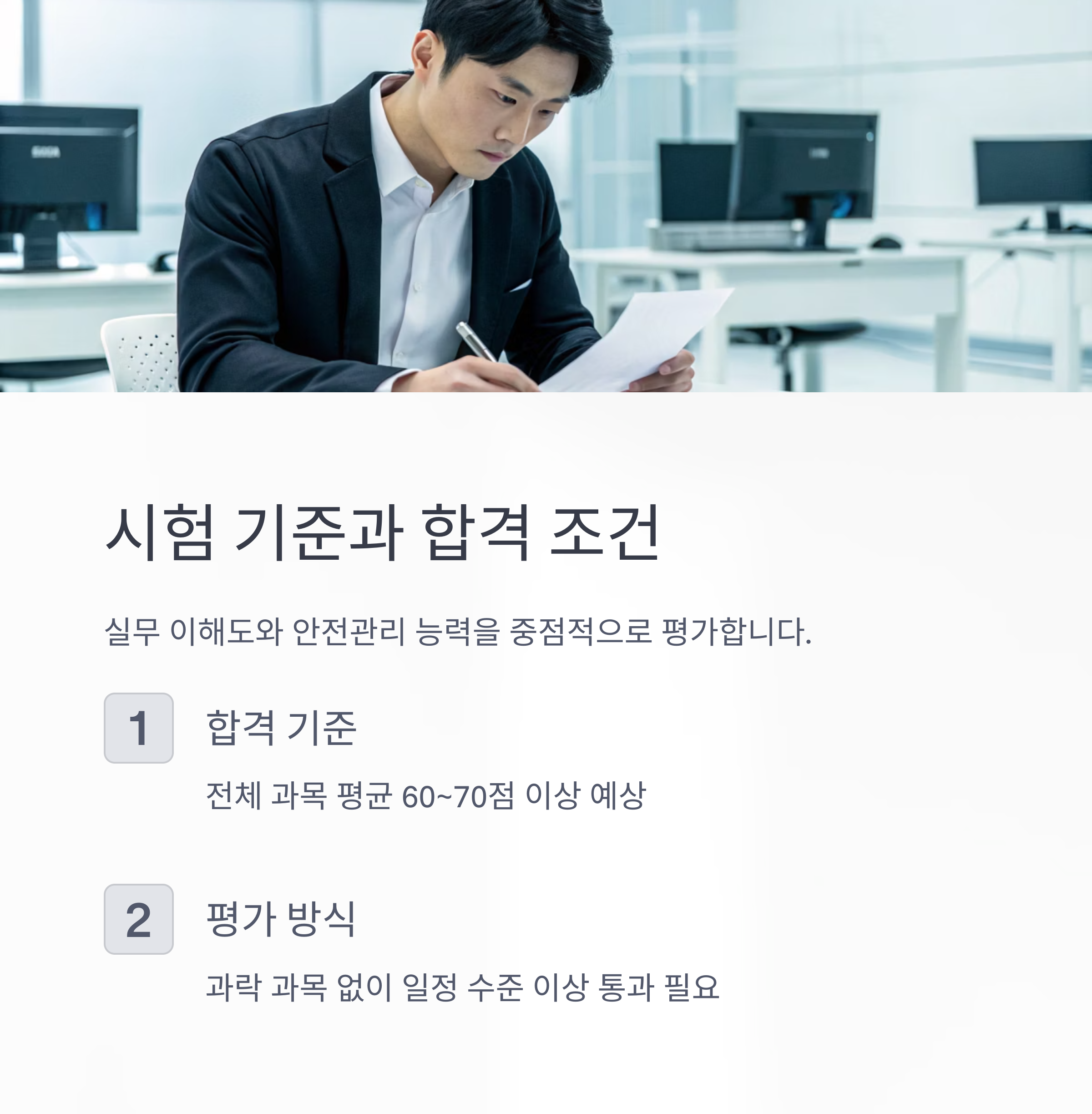 이 시험은 단순 지식보다 실무 이해도와 안전관리 능력을 중점적으로 평가할 가능성이 높습니다.