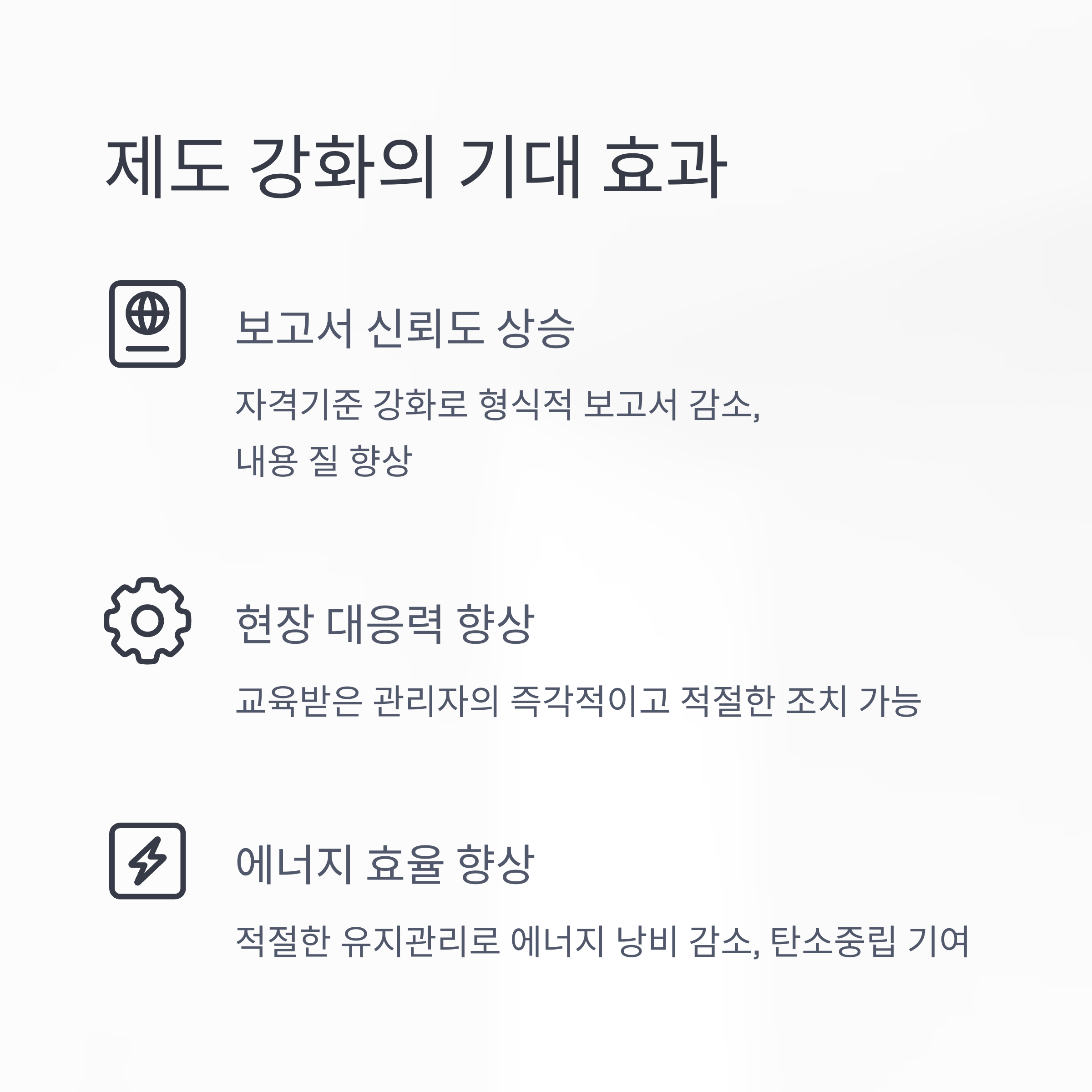 - • 보고서 신뢰도 상승: 자격기준이 강화되면 형식적인 보고서가 줄고, 내용의 질이 높아질 거예요.