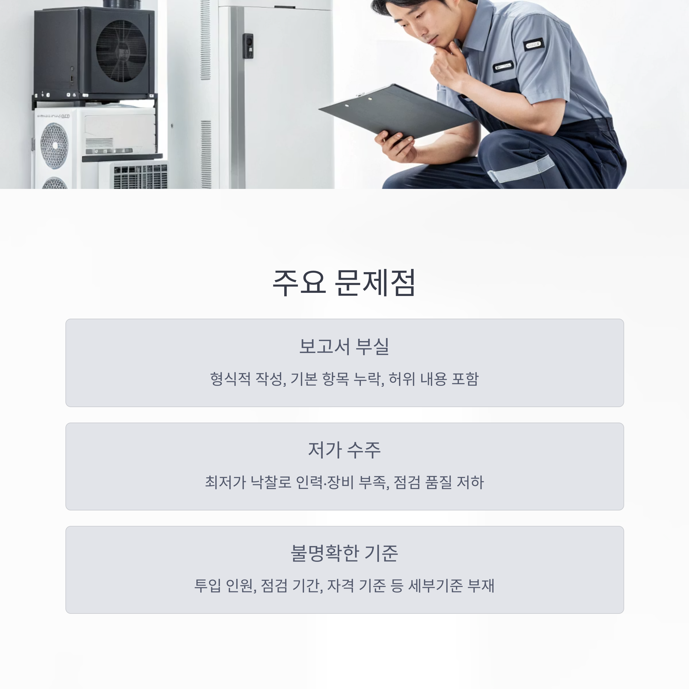 설비를 실제로 점검하지 않고도 보고서를 작성하는 경우도 있다는 말이 나올 정도로,