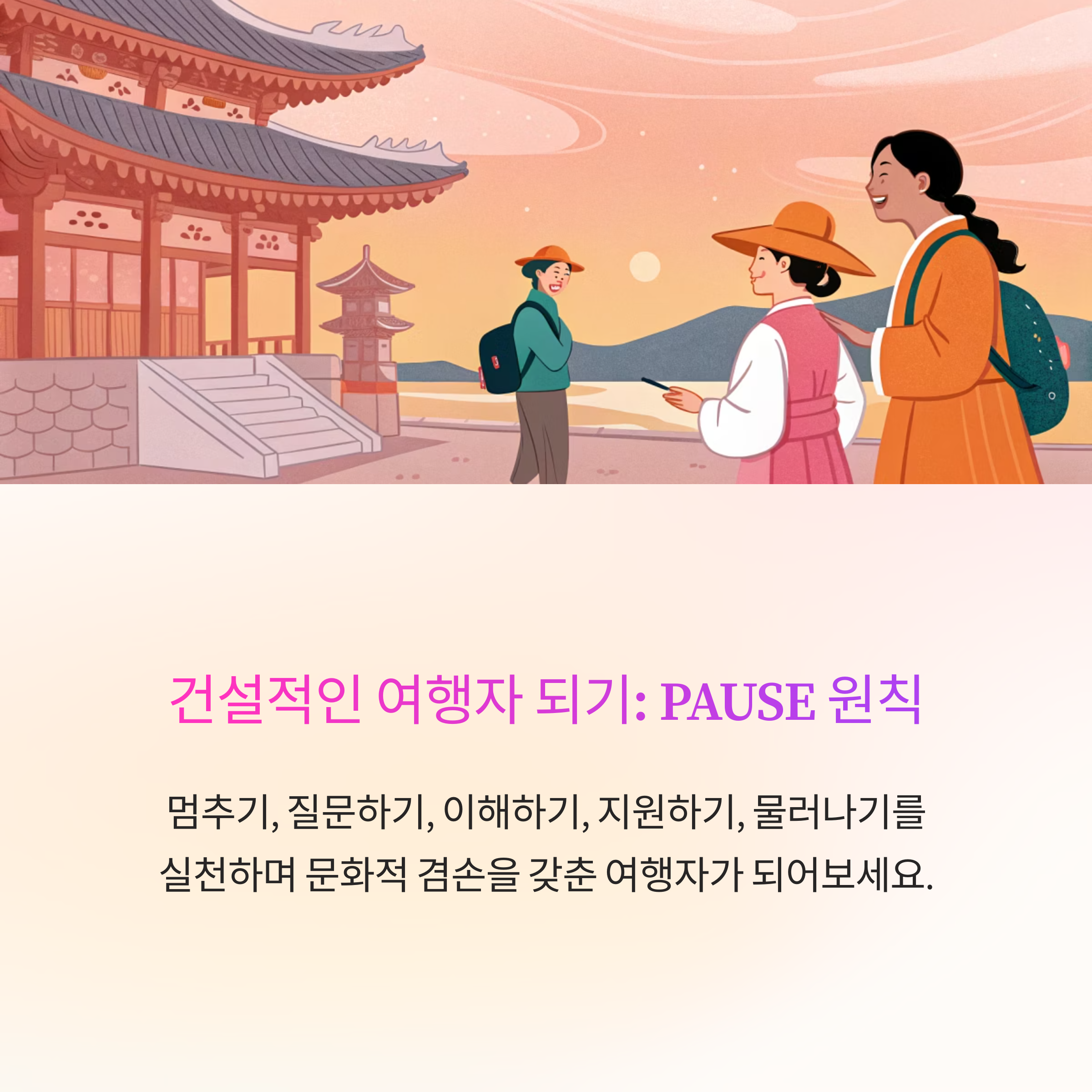 여행자 스스로는 ‘PAUSE’ 원칙(멈추기, 질문하기, 이해하기, 지원하기, 물러나기)을 실천하며 자기 성찰과 문화적 겸손을 갖춘 ‘건설적 개입가’가 될 것을 권장합니다.