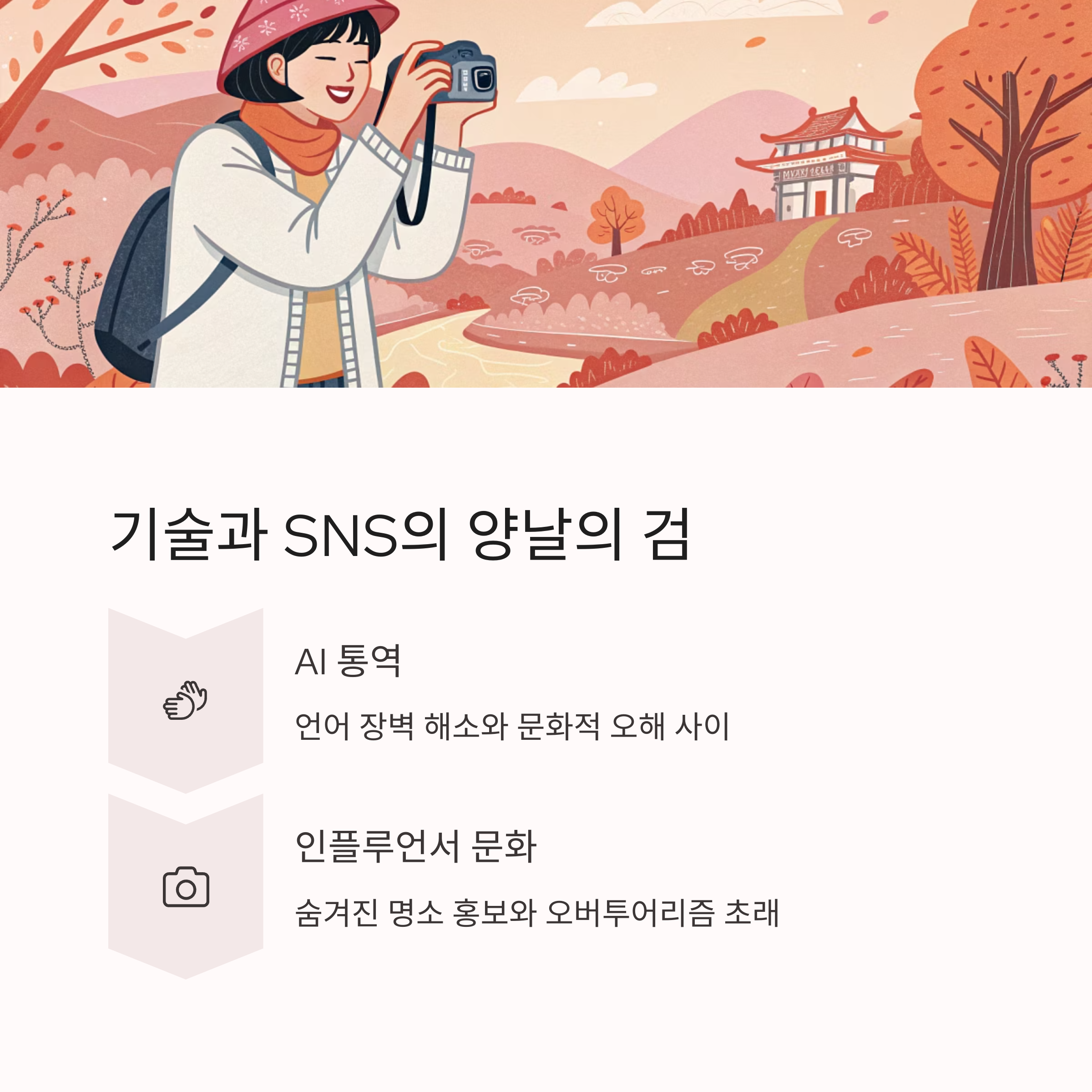 SNS 인플루언서로서 ‘오지랖 넓은 여행자’는 숨겨진 명소를 홍보하며 관광 붐을 일으키지만, 과도한 노출은 오버투어리즘과 지역 변질을 초래합니다.
