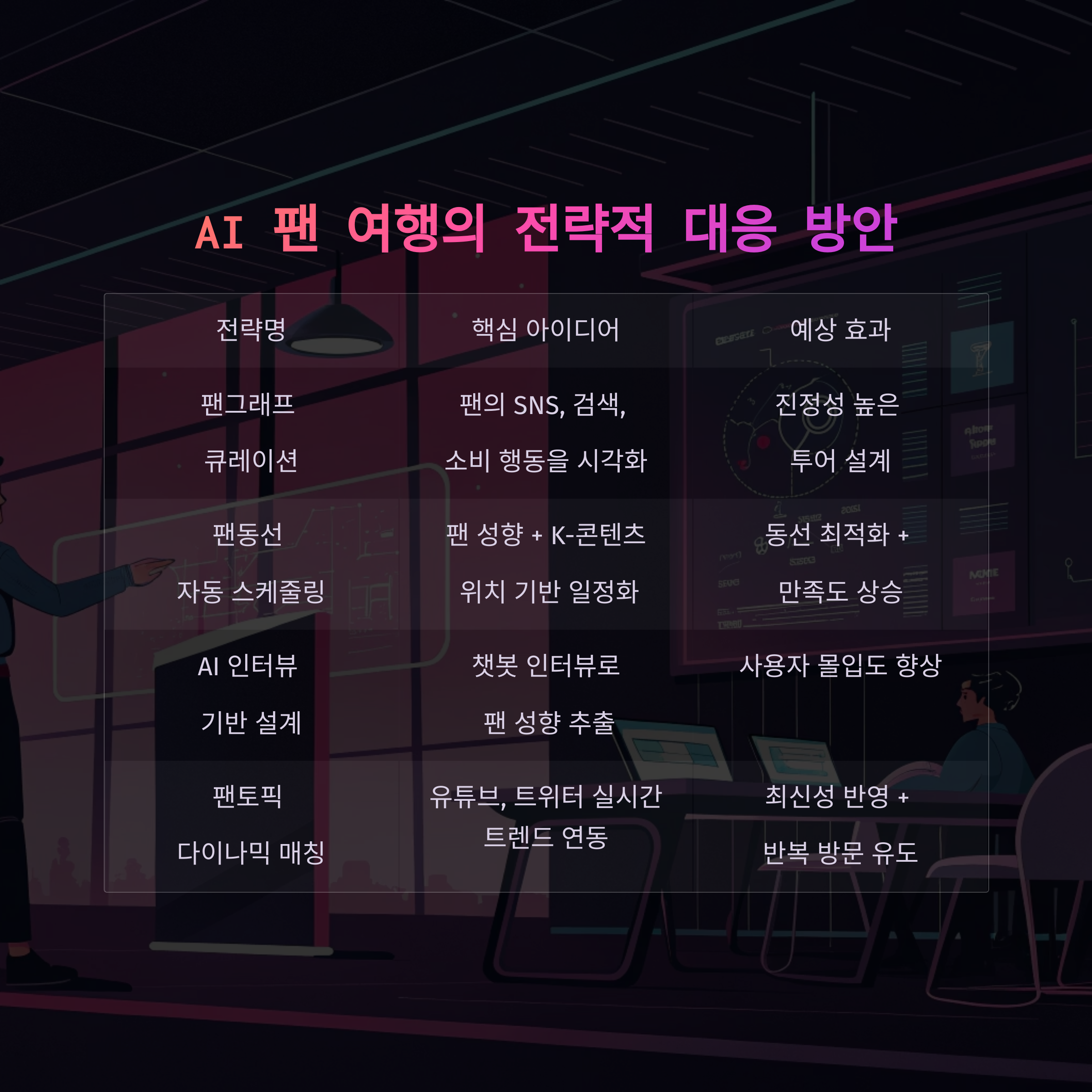| 팬그래프 기반 큐레이션 AI | 팬의 SNS, 검색, 소비 행동을 시각화 | 팬별 여행 그래프 생성 → AI 추천 연동 | 진정성 높은 투어 설계 가능 | 개인정보 및 윤리 이슈 관리 필요 |