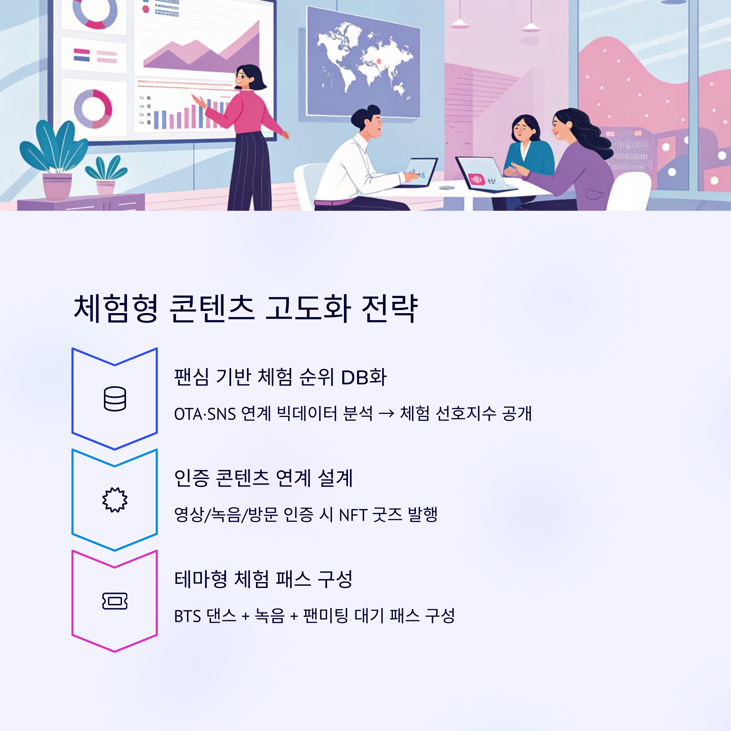 | 테마형 체험 패스 구성 | 2~3개 체험 콘텐츠 번들링 | BTS 댄스 + 녹음 + 팬미팅 대기 패스 구성 | 예약률 상승 + 체류 시간 증가 | 운영 동선 조율 필요 |