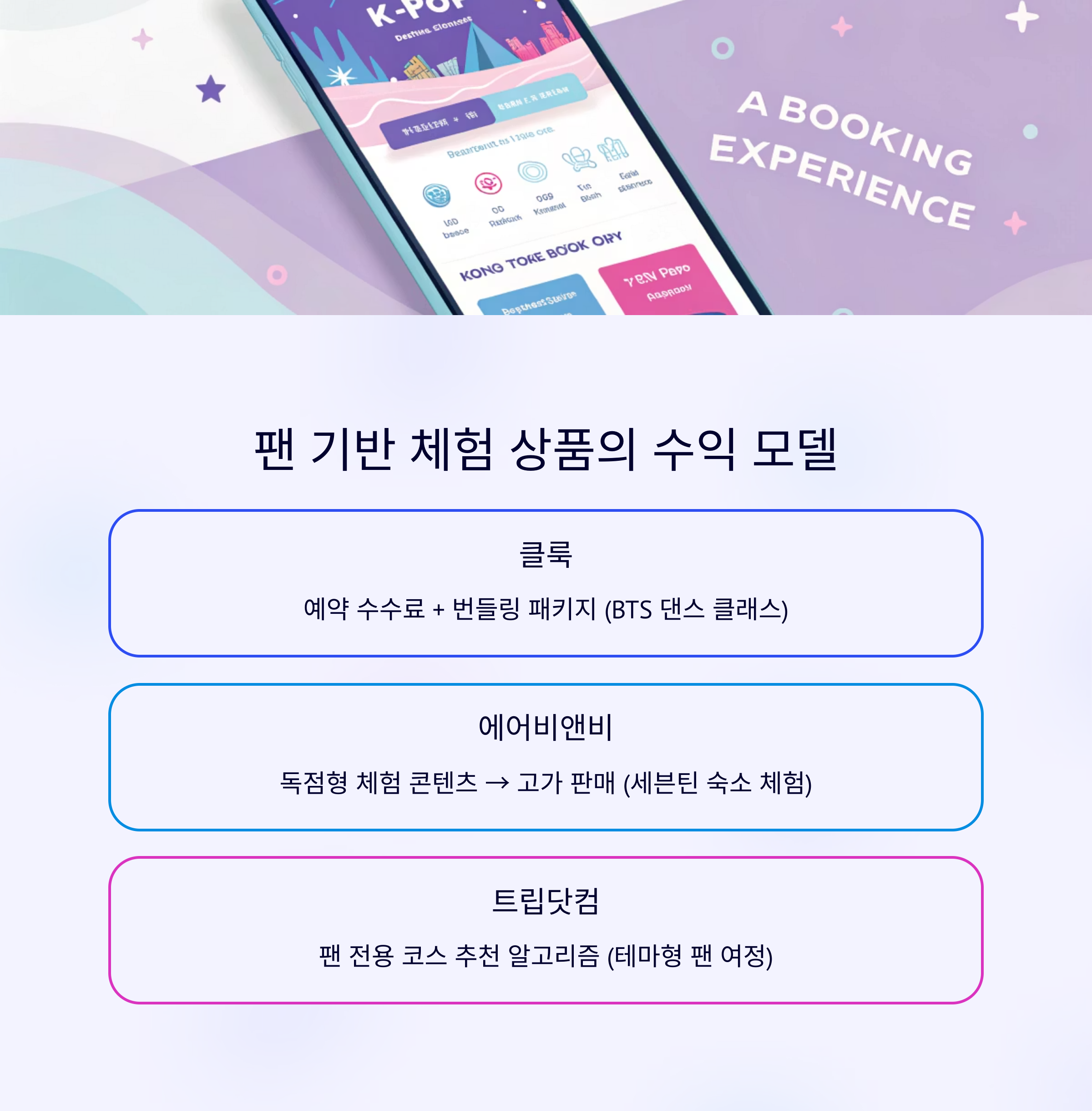 글로벌 OTA들은 K-팝 팬 콘텐츠를 체험형 관광 상품으로 정교하게 구조화하며, 다음과 같은 수익 모델을 확립하고 있다.