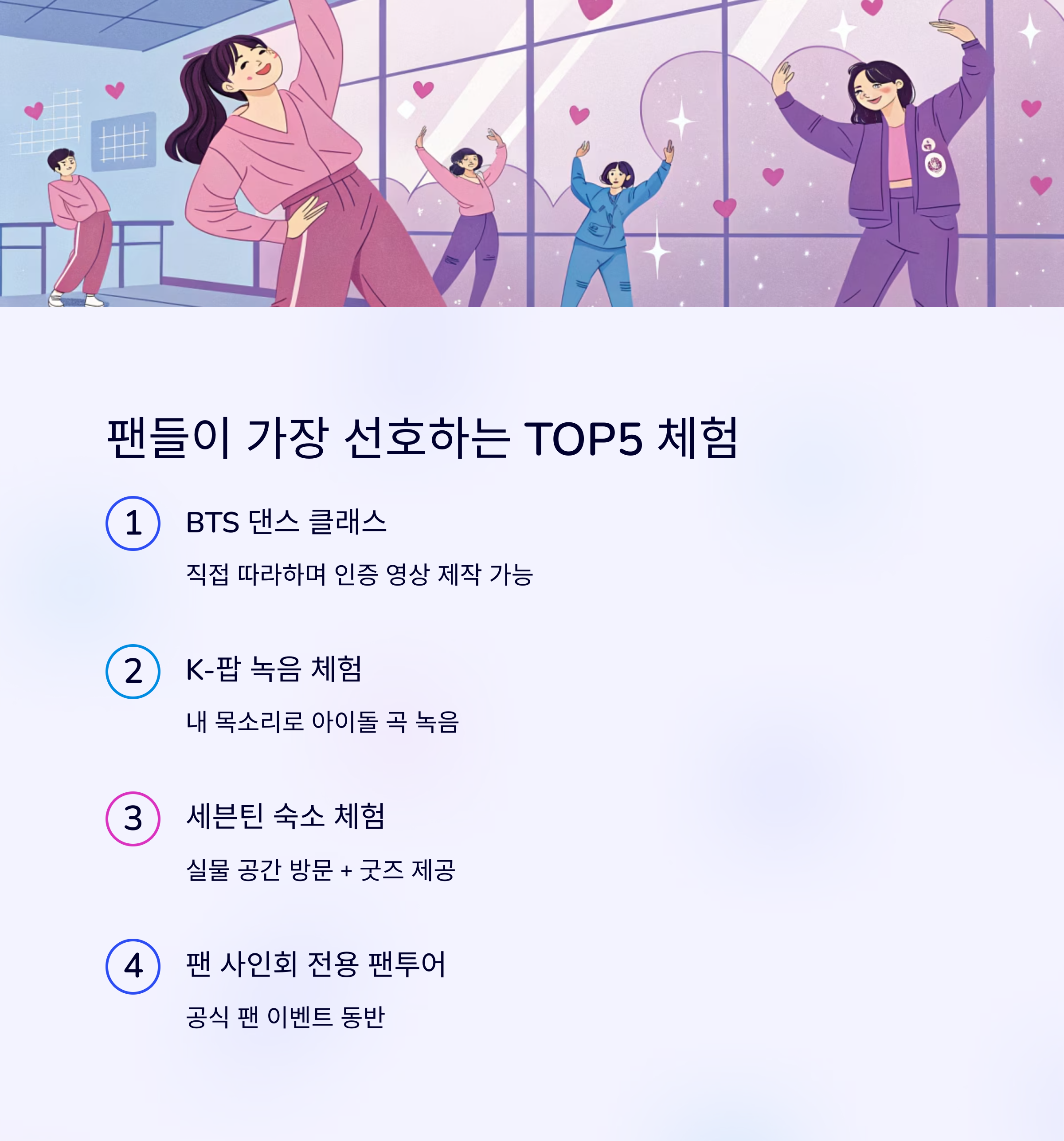 팬들이 선택한 TOP5 체험 콘텐츠는 단순 경험을 넘어, ‘팬의 정체성’으로 작용하며 관광 산업의 새로운 수익 축을 형성 중이다.
